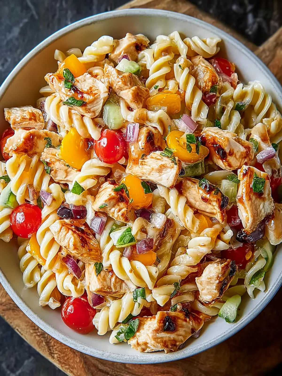A delicious BBQ chicken pasta salad filled with colorful veggies and zesty flavors.