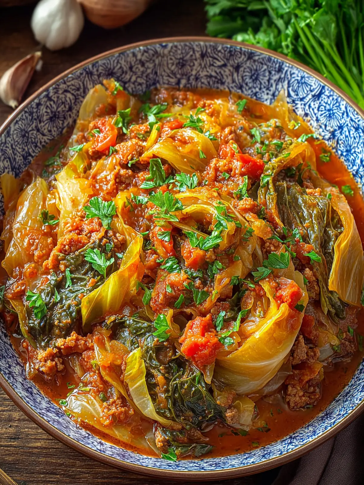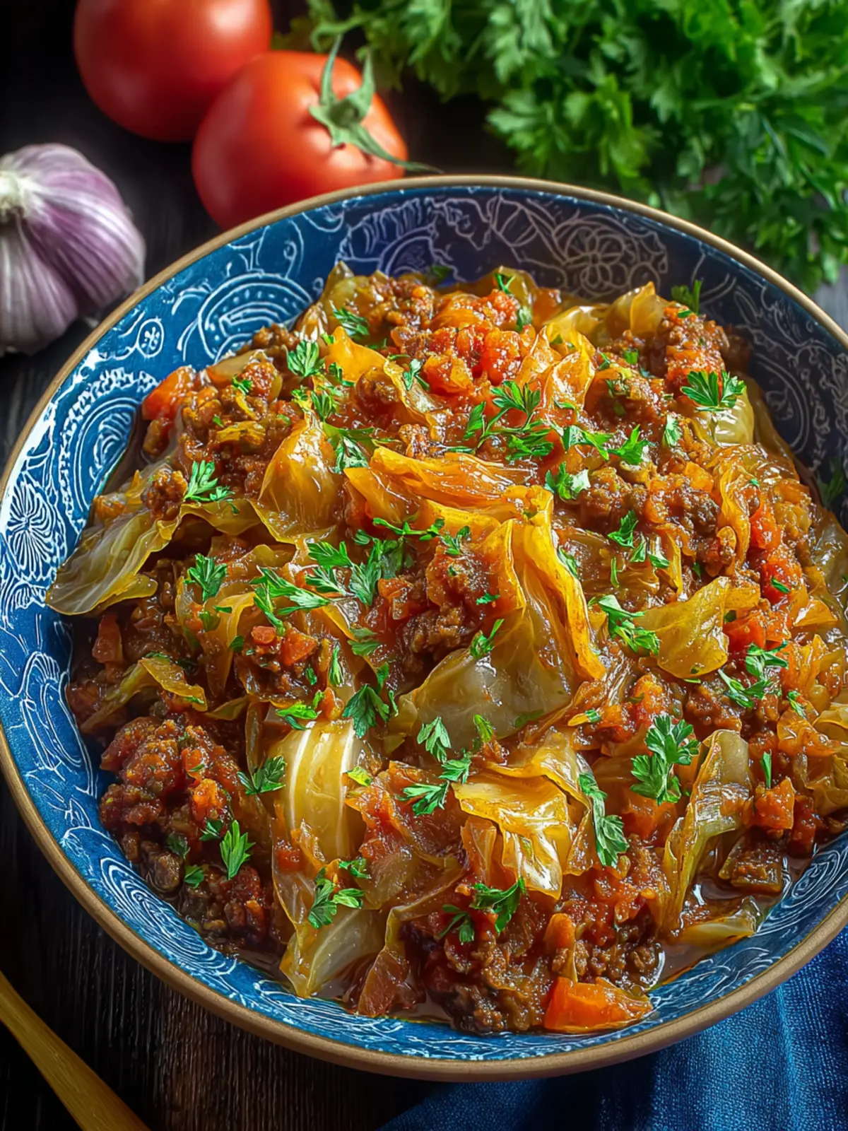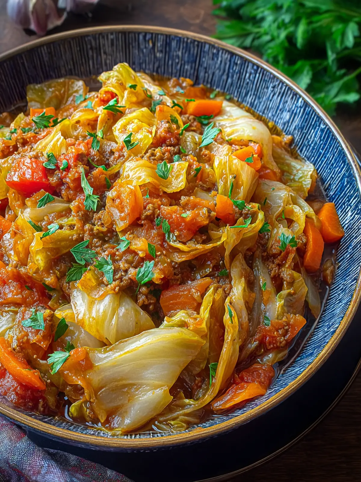 A hearty stew made with ground beef, cabbage, and tomatoes, perfect for a warm meal.