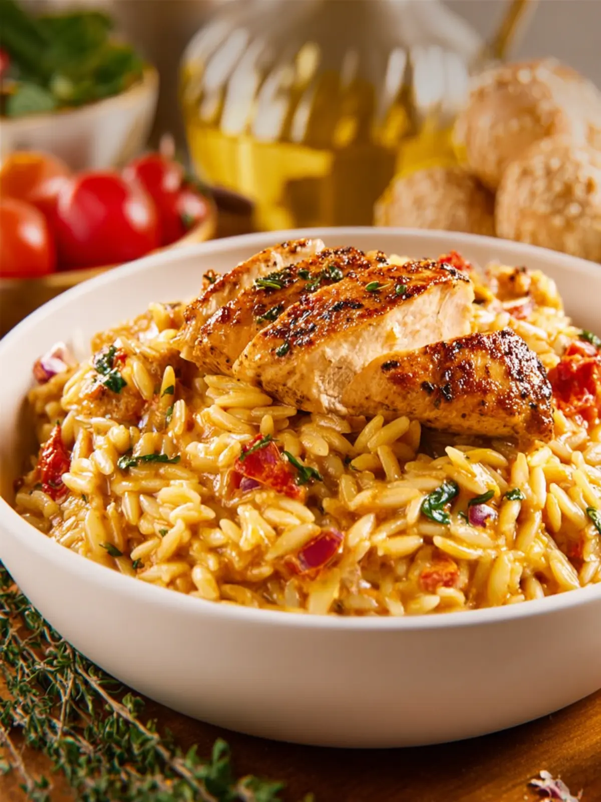 A delicious creamy chicken dish with sun-dried tomatoes and orzo pasta.