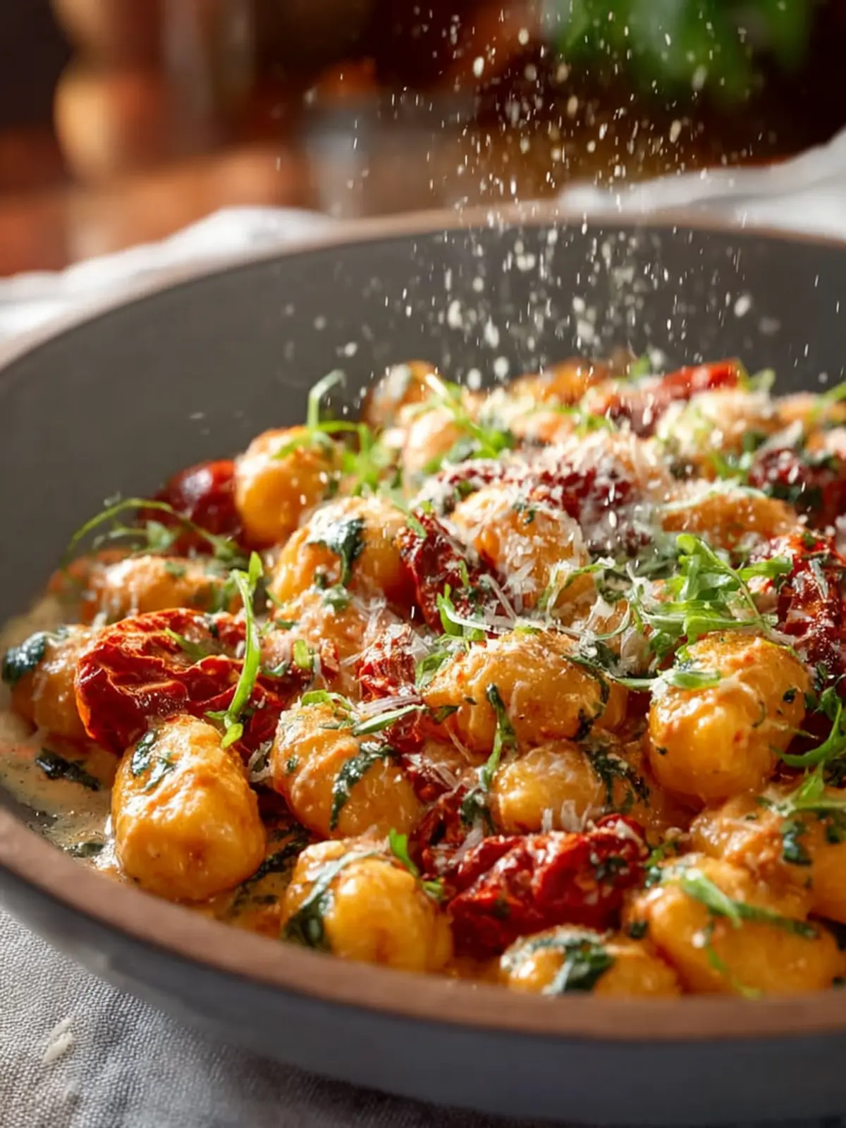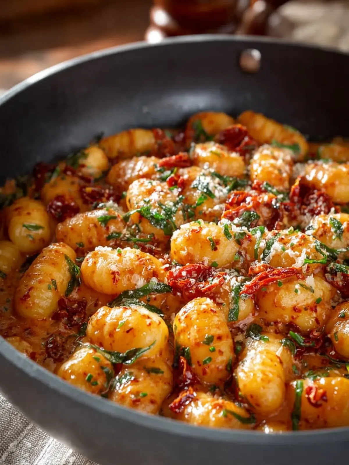 This creamy gnocchi dish features a delightful combination of flavors including sun-dried tomatoes, garlic, and fresh spinach.