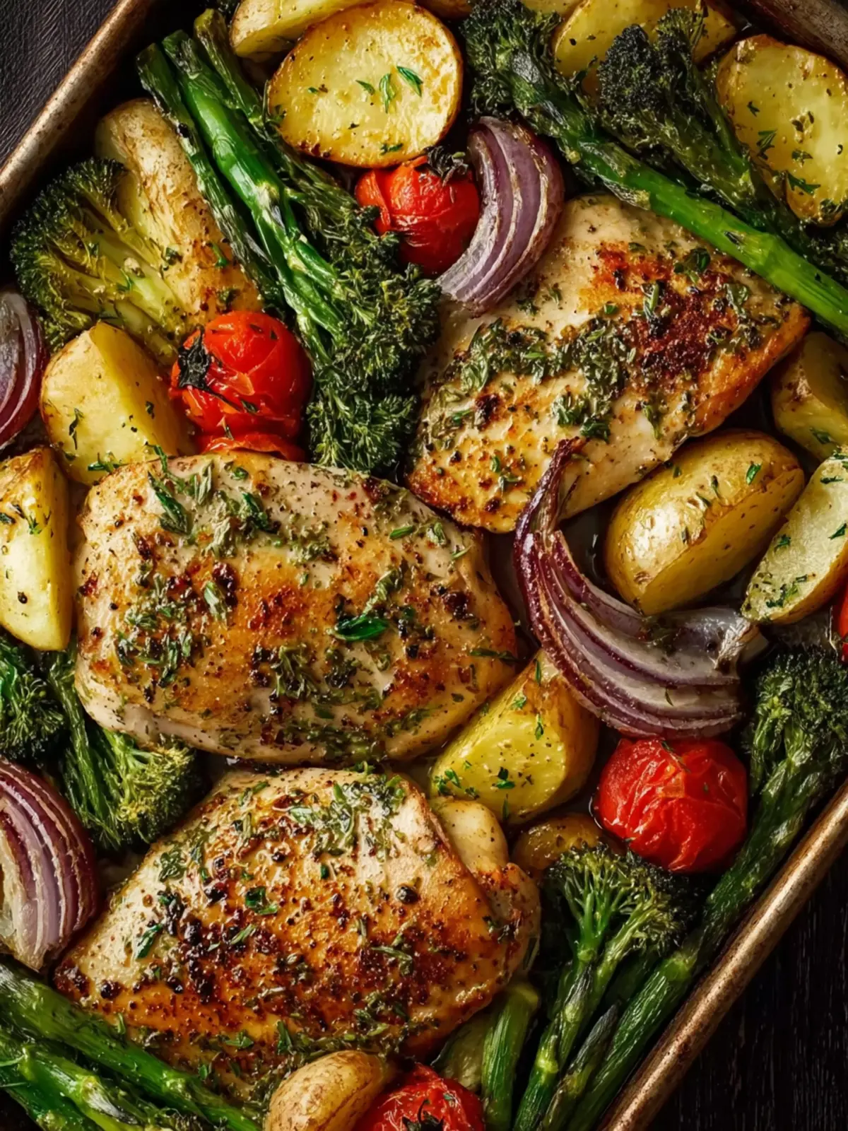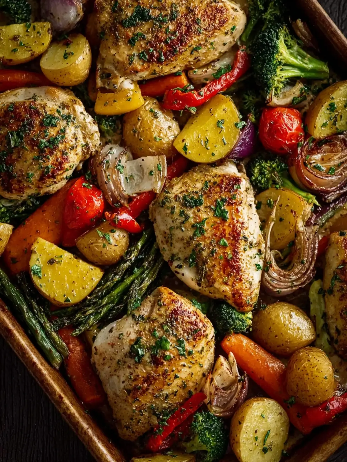 - Place the sheet pan in the oven and roast for 25–30 minutes, or until the chicken is cooked through (internal temp of 165°F) and the vegetables are tender with crisped edges. If you want extra browning, broil for an additional 2–3 minutes at the end.