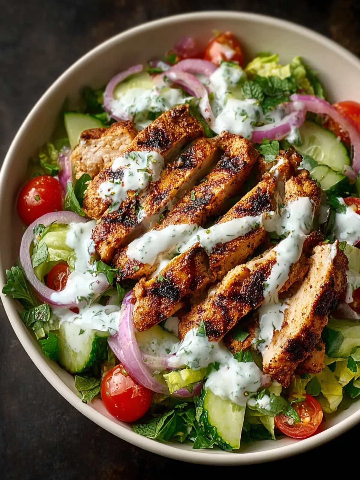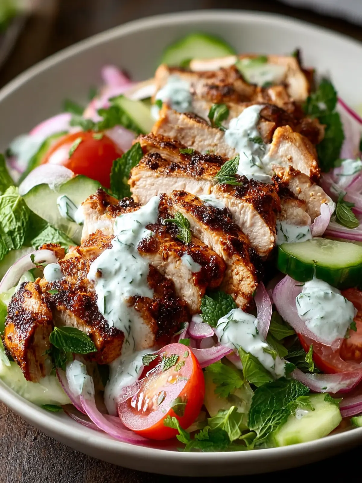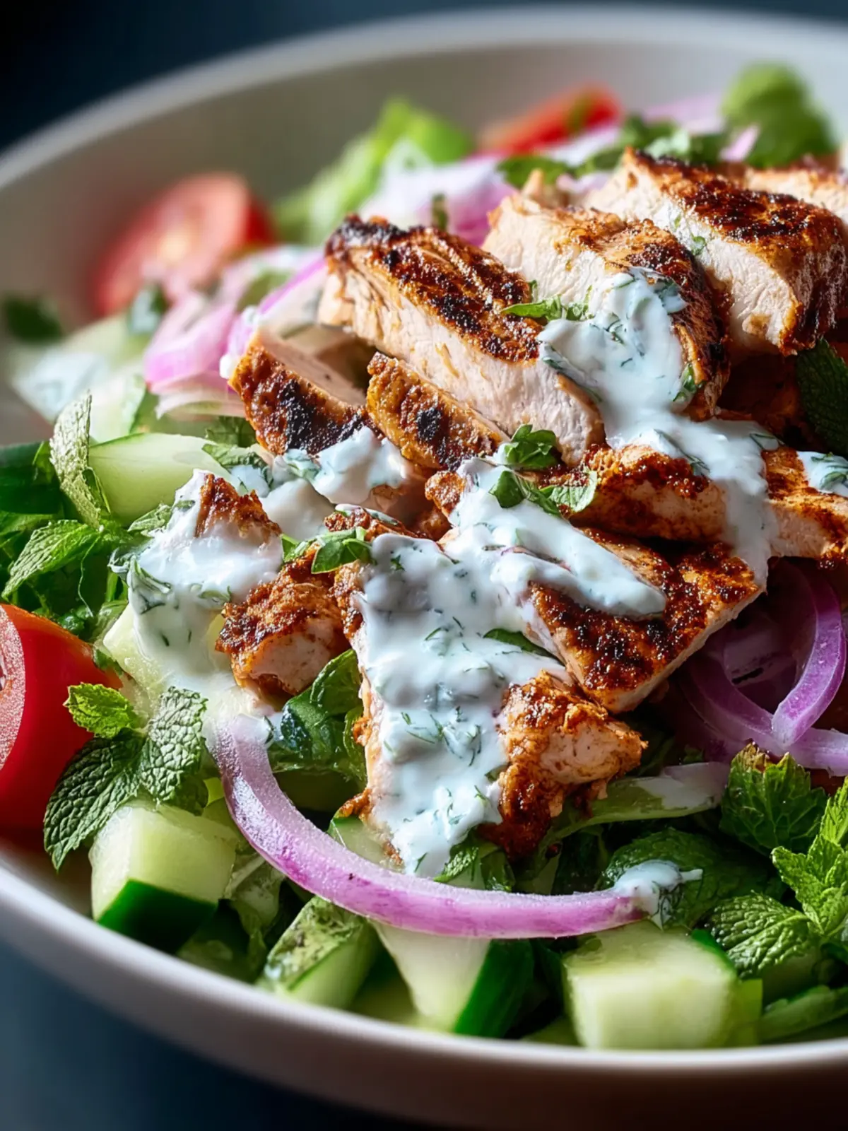 Warm Pita Bread: Serve your salad alongside warm, fluffy pita bread. The pockets are perfect for scooping up the creamy yogurt dressing and spiced chicken, giving each bite a comforting texture.